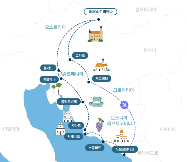 인천-비엔나(1)-그라츠-자그레브(1)-항공이동-두브로브니크(2)-스플리트-시베니크-자다르(1)-플리트비체-류블랴나(1)-블레드-류블라냐(1)-비엔나-기내(1)-인천