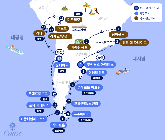 [도시 안내] ▶ 상파울루 남미 최대의 경제 도시이자 현대적인 마천루와 다양한 문화가 공존하는 활기찬 메트로폴리스▶ 이과수 폭포 세계 3대 폭포 중 하나로 압도적인 물줄기와 대자연의 위용을 느낄 수 있는 폭포▶ 리우데자네이루 거대 예수상과 코파카바나 해변이 어우러진 세계 3대 미항이자 정열적인 삼바의 도시▶ 부에노스아이레스 '남미의 파리'라는 별칭답게 고풍스러운 유럽풍 건물과 정통 탱고의 선율이 흐르는 낭만적인 도시▶ 몬테비데오 우루과이의 수도로, 차분하고 여유로운 분위기 속에서 맛있는 아사도(바비큐)와 구시가지의 매력을 즐길 수 있는 도시▶ 푸에르토 마드린 야생 동물의 낙원으로 불리며, 계절에 따라 펭귄, 바다사자, 고래를 가까이서 관찰할 수 있는 항구▶ 포클랜드(스탠리) 영국령의 아기자기한 마을 풍경과 수많은 펭귄 서식지가 펼쳐지는 남대서양의 특별한 섬▶ 케이프 혼 남미 대륙 최남단이자 대서양과 태평양을 잇는 상징적인 해역▶ 우수아이아 '세상의 끝'이라 불리는 세계 최남단 도시로 설산과 바다가 만나는 끝자락의 정취를 만끽할 수 있는 도시▶ 비글 해협(피오르/빙하 거리) 거대한 푸른 빙하들이 양옆으로 줄지어 선 장관을 배 위에서 감상하며 대자연의 신비를 경험▶ 푼타아레나스 마젤란 해협을 끼고 있는 칠레 남부의 거점으로 남극 탐험의 관문이자 역사적인 무역 항구▶ 푸에르토 몬트 칠레의 호수 지역으로 연결되는 통로이며 아름다운 호수와 화산, 싱싱한 해산물 시장이 유명한 도시▶ 산티아고 안데스 산맥에 둘러싸인 칠레의 수도로 세련되고 매력적인 도시▶ 리마 태평양 연안의 절벽 위에 세워진 미식의 도시로 스페인 식민지 시대의 유적과 현대적인 미학이 공존▶ 쿠스코 찬란했던 잉카 제국의 수도로 해발 3,400m에 위치한 신비로운 돌담길과 잉카의 역사가 살아 숨 쉬는 곳▶ 우루밤바/마추픽추 '공중 도시' 마추픽추를 품은 성스러운 계곡으로 잉카 문명의 정점과 경이로운 풍경을 마주하는 도시▶ 우유니 '지구 위에서 가장 큰 거울'이라 불리는 거대한 소금 사막으로 하늘과 땅의 경계가 사라지는 환상적인 풍경을 담을 수 있는 곳